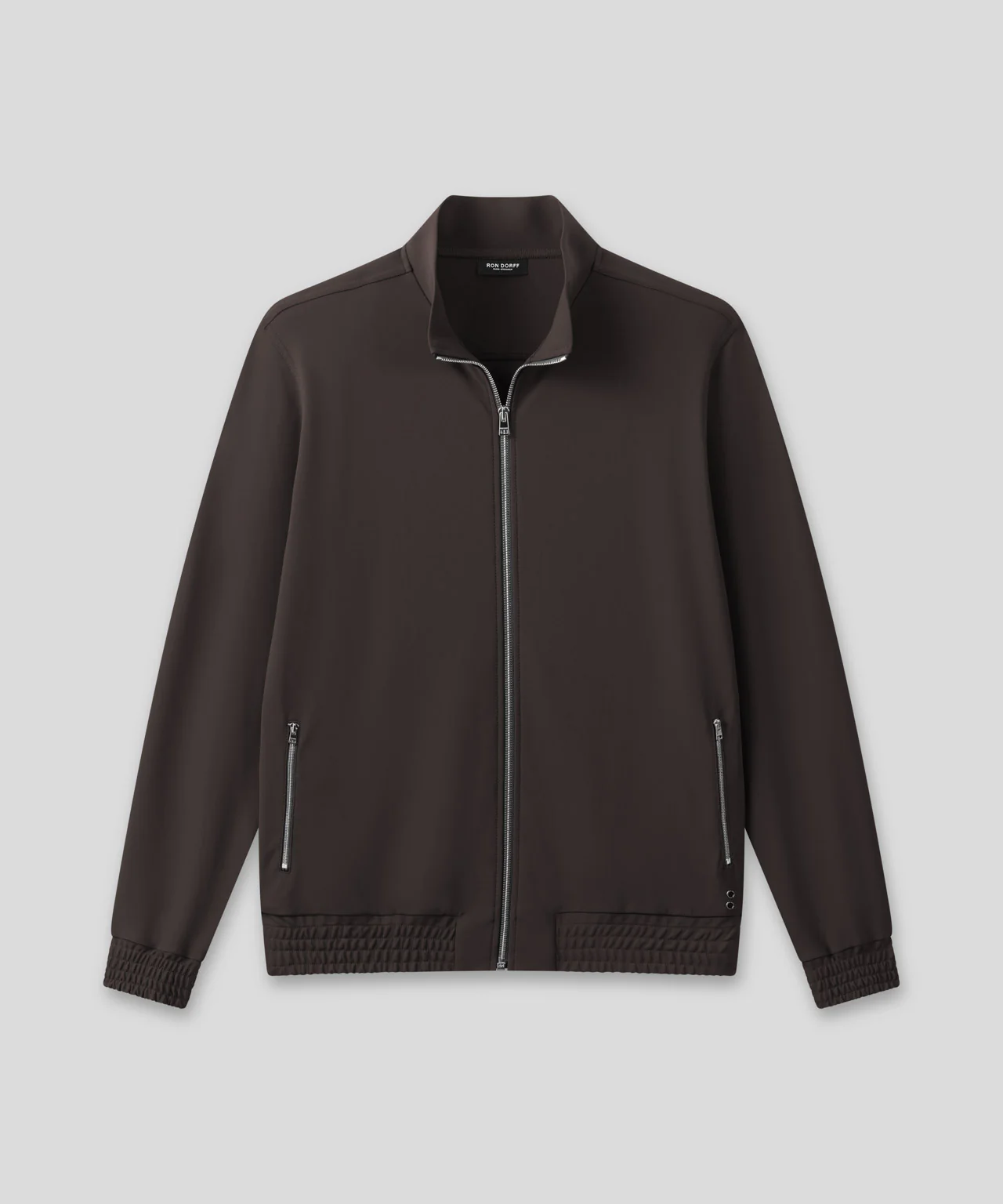The classic zipped tennis jacket revisited for chic city wear and ideal for mid-season days. Upgraded in an ultra-resistant, interlock piqué made in a high-tech mix of light nylon and spandex. Designed with a slightly tapered fit, zipped side pockets and finished with ribbed cuffs, waistband and collar. Swiss-made anti-tear zip with RON DORFF engraved puller. Featuring the double black-lacquered RD signature eyelets.