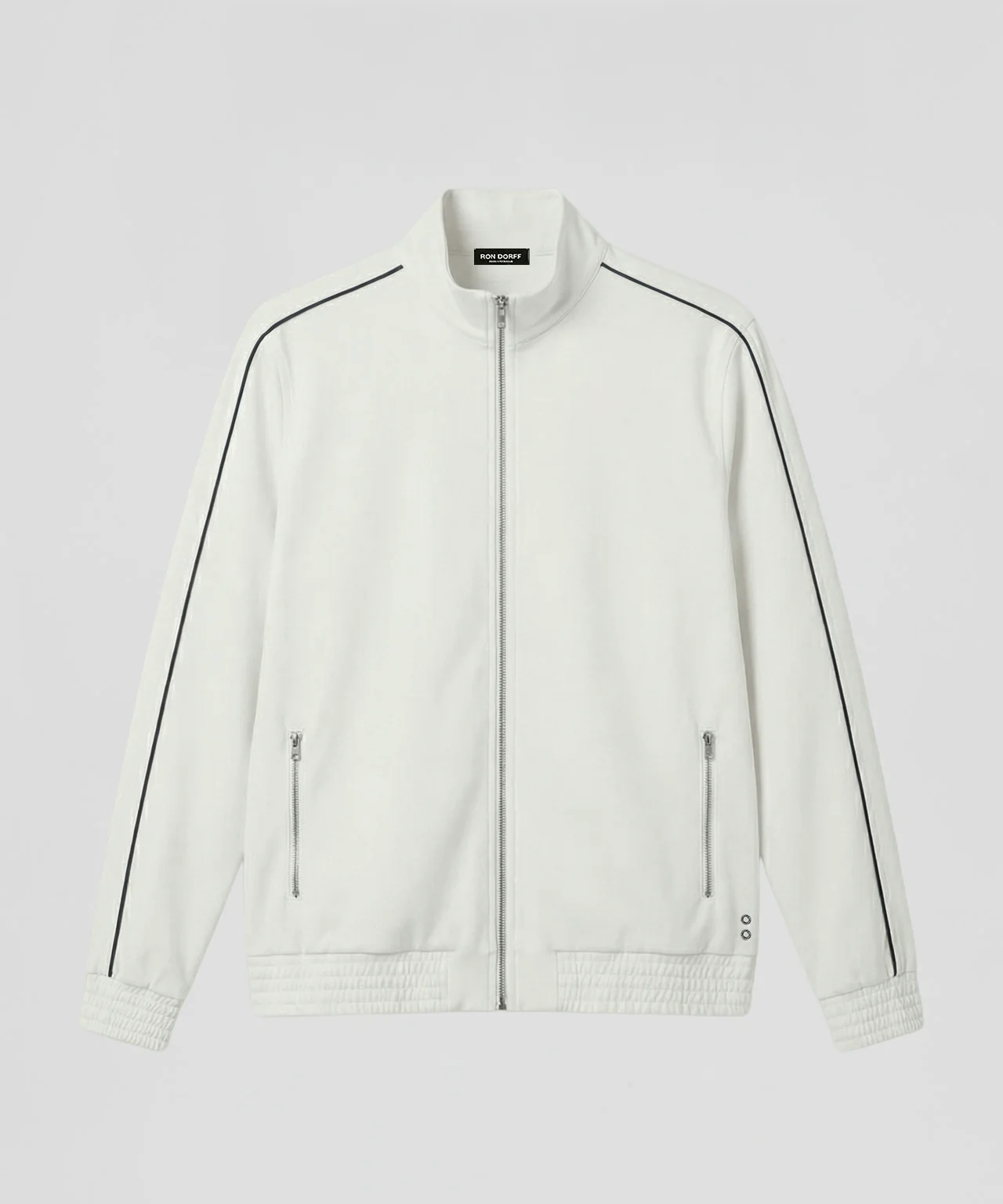 The new zipped tennis jacket with piping. Upgraded in an ultra-resistant, interlock piqué made in a high-tech mix of light nylon and spandex. Designed with a slightly tapered fit, zipped side pockets and finished with ribbed cuffs, waistband and collar. Swiss-made anti-tear zip with RON DORFF engraved puller. Featuring the double black-lacquered RD signature eyelets.